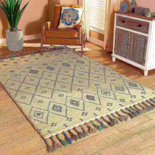 Transform the mood of simple rooms with the exciting personality of the Cremono rug. Hand tufted in India, this rug is comprised of wool. The beige base is adorned with a wide range of colors for a vibrant design that grabs the attention of guests. Clean angles form a striking diamond pattern, while colored tassels add visual flair. An astonishing piece in any space, the Cremono rug is a radiant addition to the modern home.