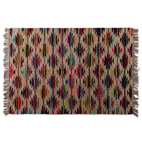 Decorate your home with the expressive design of the Zurich rug. Handwoven in India, this rug is comprised of hemp and recycled fabric. Multi-colored threads combine to form a dazzling pattern reminiscent of gems and stars. The intricate weave pattern creates a smooth surface, while soft tassels at the ends of the rug add visual flair. With its vibrant yet pleasant design, the Zurich rug is a distinctive addition to any space.