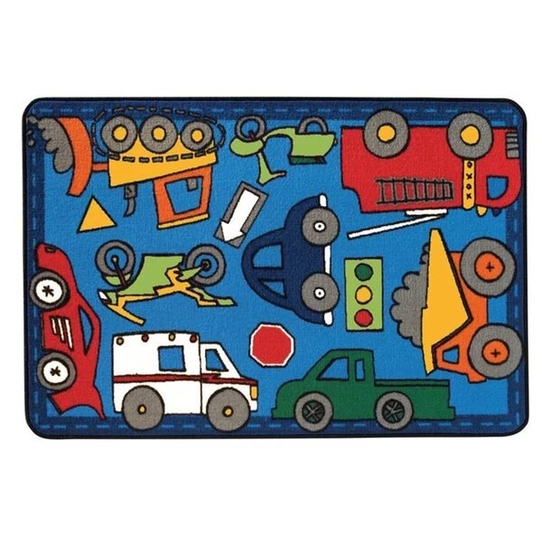 KID$ Value Line is designed to stimulate a child’s imagination through a variety of designs created for use in small play areas. Proudly made in the USA. you can be assured that our products are safe for your room; constructed with attention to detail and quality.FeaturesSkid-Resistant Backing (includes latex)Carpet Stain ProtectionMachine Washable – Cold water with mild detergent.Gentle cycle.Line dry. Do Not Bleach.Made with recyclable nylon fiberPasses CPSC FF1-70. Standard for the Surface Flammability of Carpets and RugsType – Wheels on the Go RugShape – Rectangle