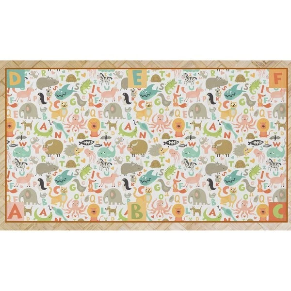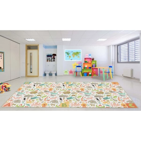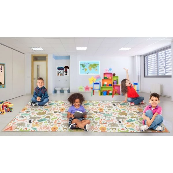 Deerlux social distancing classroom rugs help kids maintain 6 ft social distancing standards during storytime, playtime, and lessons. Designed with a colorful ABC pattern, the area rug features 6 designated seating spots that are the perfect size for kindergarten school kids, and are distanced 6 feet from each other. Alphabets and cute animal designs are scattered around the floor surface, to help kids learn about ABCs at a young age. Machine tufted with durable synthetic fibers, the rug has a soft and comfortable texture, does not shed, and is easy to clean. Its low .25” pile makes it ideal for high traffic areas and is comfortable to sit on. A slip resistant latex backing keeps the area rug safely in place. Its timeless design makes it ideal for classrooms, daycares, preschools, and children's libraries, as well as home playrooms and kids bedrooms.