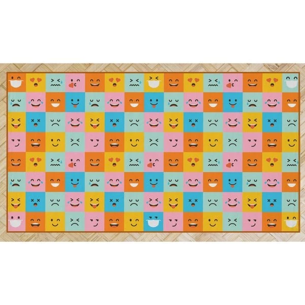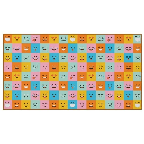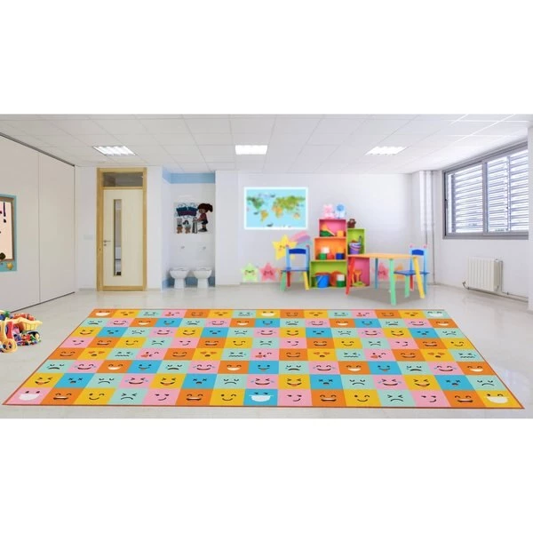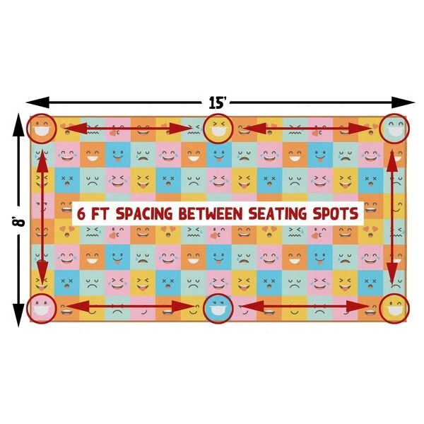 Deerlux social distancing classroom rugs help kids maintain 6 ft social distancing standards during storytime, playtime, and lessons. Designed with a colorful masked emoji pattern, the area rug features 6 designated seating spots that are the perfect size for kindergarten school kids, and are distanced 6 feet from each other. Machine tufted with durable synthetic fibers, the rug has a soft and comfortable texture, does not shed, and is easy to clean. Its low .25” pile makes it ideal for high traffic areas and is comfortable to sit on. A slip resistant latex backing keeps the area rug safely in place. Its timeless design makes it ideal for classrooms, daycares, preschools, and children's libraries, as well as home playrooms and kids bedrooms.