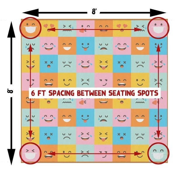 Deerlux social distancing classroom rugs help kids maintain 6 ft social distancing standards during storytime, playtime, and lessons. Designed with a colorful masked emoji pattern, the area rug features 4 designated seating spots that are the perfect size for kindergarten school kids, and are distanced 6 feet from each other. Machine tufted with durable synthetic fibers, the rug has a soft and comfortable texture, does not shed, and is easy to clean. Its low .25” pile makes it ideal for high traffic areas and is comfortable to sit on. A slip resistant latex backing keeps the area rug safely in place. Its timeless design makes it ideal for classrooms, daycares, preschools, and children's libraries, as well as home playrooms and kids bedrooms.