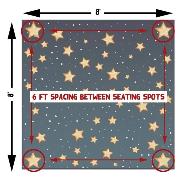 Deerlux social distancing classroom rugs help kids maintain 6 ft social distancing standards during storytime, playtime, and lessons. Designed with a starry sky pattern, the area rug features 4 designated seating spots that are the perfect size for kindergarten school kids, and are distanced 6 feet from each other. Machine tufted with durable synthetic fibers, the rug has a soft and comfortable texture, does not shed, and is easy to clean. Its low .25” pile makes it ideal for high traffic areas and is comfortable to sit on. A slip resistant latex backing keeps the area rug safely in place. Its timeless design makes it ideal for classrooms, daycares, preschools, and children's libraries, as well as home playrooms and kids bedrooms.