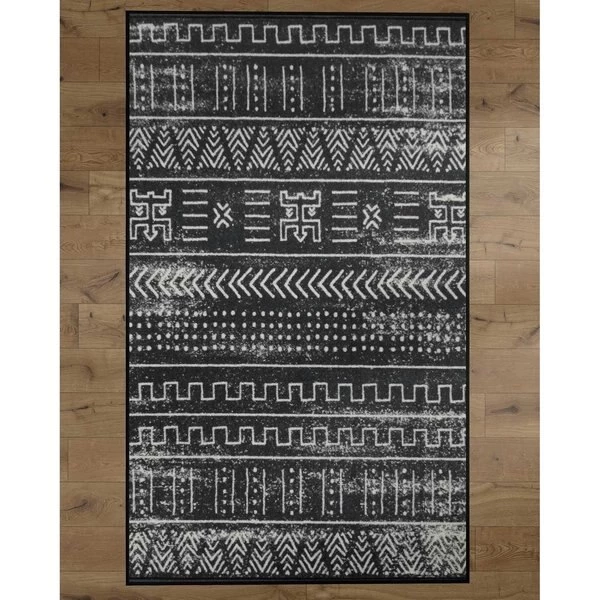 Art does not have to be displayed exclusively on walls. Let your floors show off some flair too! Add a dash of boho style to your home décor with this beautiful Black Boho area rug. Featuring a bohemian tribal style pattern against a black background, its nuetral color scheme will fit in with any décor theme. Machine tufted with durable synthetic fibers, it has a soft and comfortable texture, does not shed, and is easy to clean. Its low .25” pile makes it ideal for high traffic areas of your home and will not obstruct doorways. A slip resistant latex backing keeps the area rug safely in place. Whether you display it in your living room, bedroom, home office, dining room, foyer, or nursery, it’ll bring your home décor to the next level.
