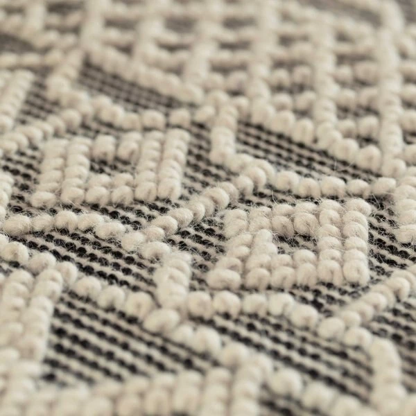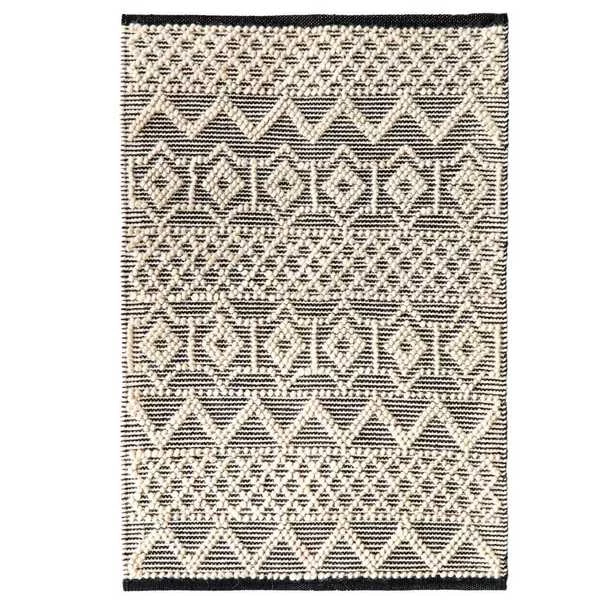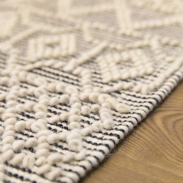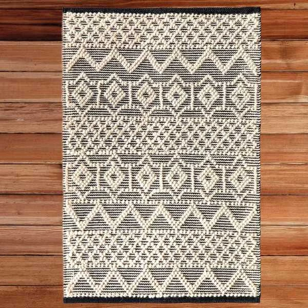 Layer up cozy boho style on your floor with a Deerlux Handwoven Kilim Rug. Kilim rugs are pileless, flatwoven rugs that are durable, lightweight, and reversible. Handwoven by skilled artisans, the rug is composed of 65% wool and 35% cotton for a breathable surface that's suitable for all year round. Its low height is easy to clean and move around, and is perfect for high traffic zones such as kitchens, hallways, and entryways. The rug design features a black and white hand knotted background contrasted by a geometric pattern of white bobbles,