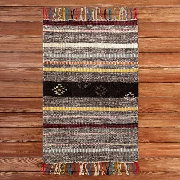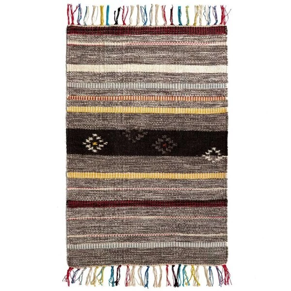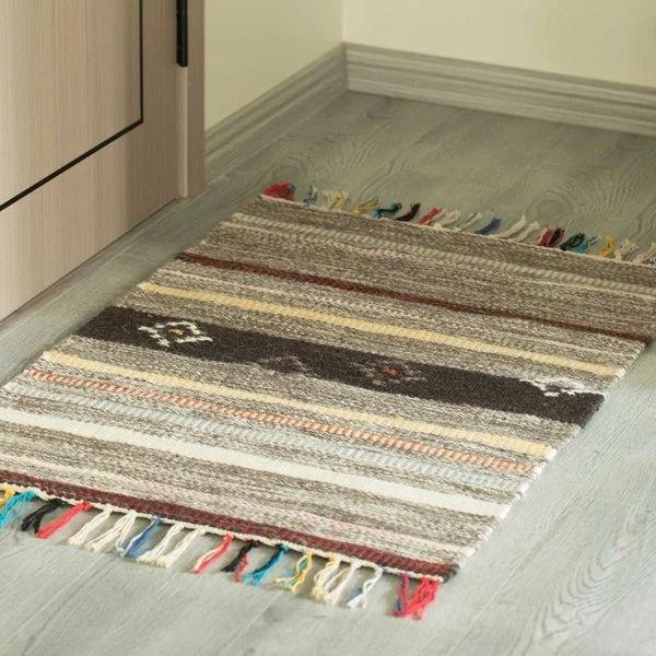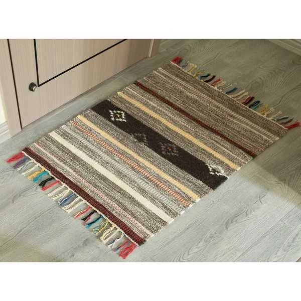 Layer up cozy boho style on your floor with a Deerlux Handwoven Kilim Rug. Kilim rugs are pileless, flatwoven rugs that are durable, lightweight, and reversible. Handwoven by skilled artisans, the rug is composed of 80% wool and 20% cotton for a breathable surface that's suitable for all year round. Its low height is easy to clean and move around, and is perfect for high traffic zones such as kitchens, hallways, and entryways. The rug design features muted stripes of colors and scattered tribal motifs, finished off by beige, black, red and blue tassels at the edges.