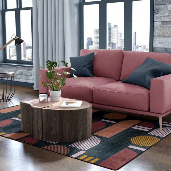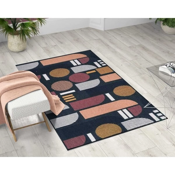 Art does not have to be displayed exclusively on walls. Let your floors show off some flair too! Add a dash of modern style to your home décor with this beautiful Abstract Geo area rug. Featuring abstract geometric shapes against a blue background, its subdued color scheme will fit in with any décor theme. Machine tufted with durable synthetic fibers, it has a soft and comfortable texture, does not shed, and is easy to clean. Its low .25” pile makes it ideal for high traffic areas of your home and will not obstruct doorways. A slip resistant latex backing keeps the area rug safely in place. Whether you display it in your living room, bedroom, home office, dining room, foyer, or nursery, it’ll bring your home décor to the next level.