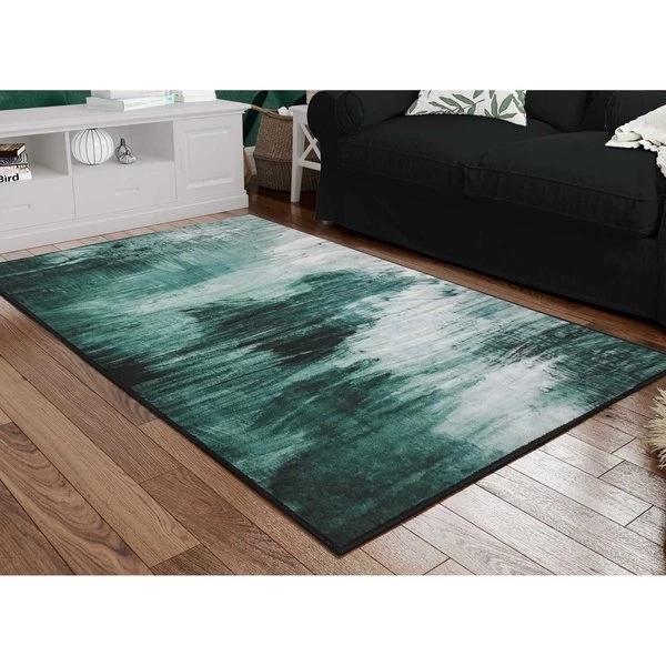 Art does not have to be displayed exclusively on walls. Let your floors show off some flair too! Add a dash of modern style to your home décor with this beautiful Abstract Teal area rug. Featuring abstract green blue brushstrokes against a white background, its subdued color scheme will fit in with any décor theme. Machine tufted with durable synthetic fibers, it has a soft and comfortable texture, does not shed, and is easy to clean. Its low .25” pile makes it ideal for high traffic areas of your home and will not obstruct doorways. A slip resistant latex backing keeps the area rug safely in place. Whether you display it in your living room, bedroom, home office, dining room, foyer, or nursery, it’ll bring your home décor to the next level.