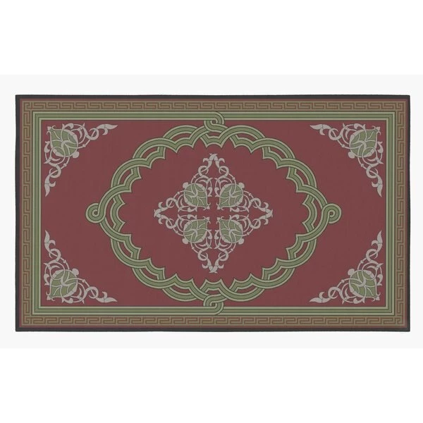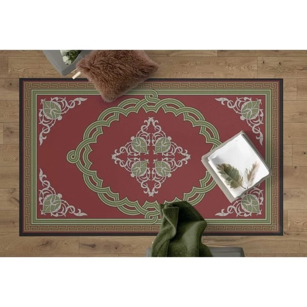 Art does not have to be displayed exclusively on walls. Let your floors show off some flair too! A modern twist on traditional style, the rug design blends a clean aesthetic with the classic intricate medallion featured in the center. Featuring a bold scheme of green hues against a deep red background, it will stand out in any space. Machine tufted with durable synthetic fibers, it has a soft and comfortable texture, does not shed, and is easy to clean. Its low .25” pile makes it ideal for high traffic areas of your home and will not obstruct doorways. A slip resistant latex backing keeps the area rug safely in place. Whether you display it in your living room, bedroom, home office, dining room, foyer, or nursery, it’ll bring your home décor to the next level.