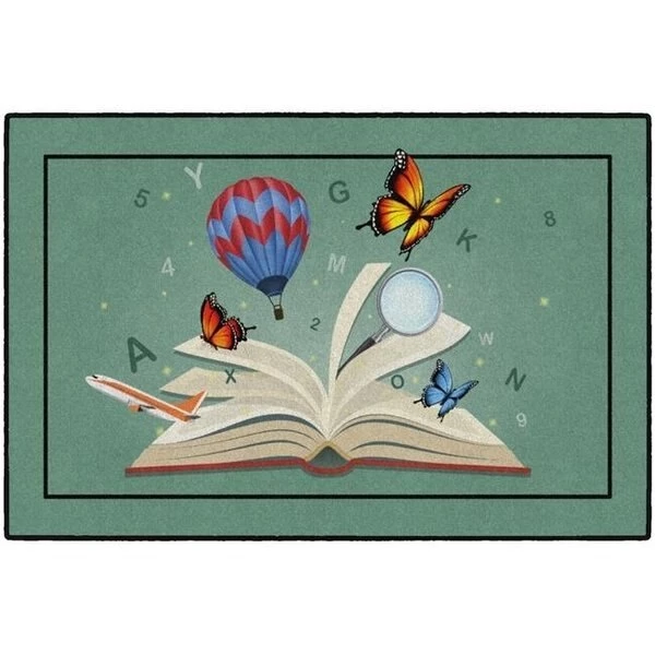 The Explore Through Reading rug beautifully illustrates the wonder and adventure of reading books. This design. on a teal background. features an open book with various objects floating from its pages. Printed on 22 oz. nylon cut pile with latex backing. this rug is durably constructed and is washable for easy care. This rug meets Class 1 Flammability Rating and is Green Label Plus Certified by CRI's Indoor Air Quality program. The Explore Through Reading rug is made in the USA using the most advanced technology in printed rug manufacturing. Flagship Carpets is a woman-owned company that has been creating and manufacturing quality textiles for over 40 years. Flagship has the distinction of being the only direct manufacturer in the educational carpet and rug market. We offer state of the art digital print technology providing the education industries only 76 dpi (dots per square inch) high definition dye infusion technology with over 13.000 possible colors. the most innovative and flexible carpet printing machinery in the world. All Flagship Carpets are CRI Green Label Plus certified and meet or exceed California indoor air quality standards for low emitting products used in schools. FeaturesMade 100% in the USAThe Flagship 'Value' collection with skid-resistant backing is machine washableScotchgard-protector for superior soil resistance and stain protection100% Invista type 6.6. Continuous Filament NylonFORCE 5. a permanent anti-microbial agent to guard against odor. mildew and moldBound and double stitched serge with nylon edge yarn for maximum strength and durabilityUseful life wear warrantySpecificationsSize: 4 x 6Shape: Rectangle