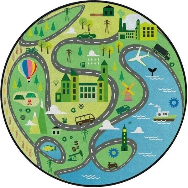 The Ride Along rug lets children explore the town by plane. car. boat. and even hot air balloon. Spark imagination and creative play with this rug featuring natural forest areas. city buildings. and a waterfront. This rug meets Class 1 Flammability Rating and is Green Label Plus Certified by CRI's Indoor Air Quality program. The Ride Along rug is made in the USA using the most advanced technology in printed rug manufacturing. Flagship Carpets is a woman-owned company that has been creating and manufacturing quality textiles for over 40 years. Flagship has the distinction of being the only direct manufacturer in the educational carpet and rug market. We offer state of the art digital print technology providing the education industries only 76 dpi (dots per square inch) high definition dye infusion technology with over 13.000 possible colors. the most innovative and flexible carpet printing machinery in the world. All Flagship Carpets are CRI Green Label Plus certified and meet or exceed California indoor air quality standards for low emitting products used in schools FeaturesMade 100% in the USAScotchgard-protector for superior soil resistance and stain protection100% Invista type 6.6. Continuous Filament NylonFORCE 5. a permanent anti-microbial agent to guard against odor. mildew and moldBound and double stitched serge with nylon edge yarn for maximum strength and durabilityUseful life wear warrantySpecificationsSize: 6'Shape: Round