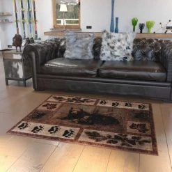 Charm visitors while adding feel-good vibes to your home with the beautiful design of this wildlife themed indoor area rug featuring a mother bear and her cubs. Ideal for nature lovers and wildlife enthusiasts, this rustic area rug will add warmth to hardwood floors and protect flooring in high-traffic areas. This rustic area rug can be a warm place for your feet by the bed, an accent piece in the living room, or a focal point in entryways. Rest assured this area rug is built for longevity. Made from olefin fibers, this durable area rug is stain and water resistant, colorfast, and provides a soft underfoot feel friendly to kids and pets. The jute backing gives this rug structural integrity and helps promote air flow. Vacuum regularly without the beater bar and spot clean with water and a mild detergent to maintain the look of your new rug.