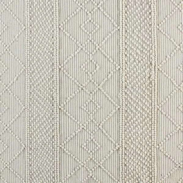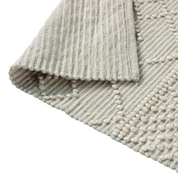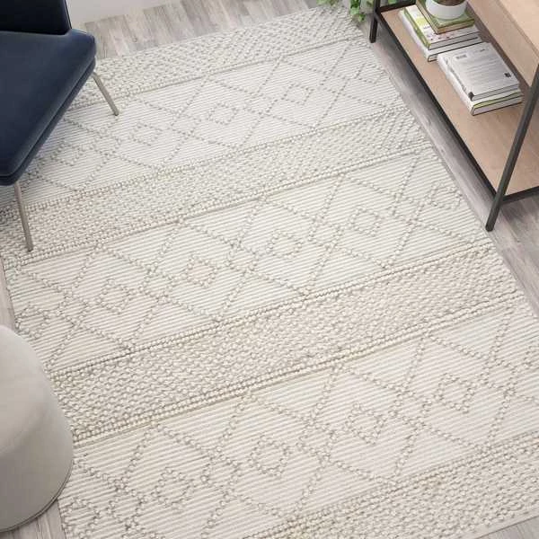 Add the modern look of this 5' x 7' handcrafted area rug anywhere in your living space to make a statement. This indoor area rug, featuring an ivory geometric motif on a solid ivory background, is a cost effective way to effortlessly transform the look and feel of a room as well as providing other benefits. If your flooring has flaws that you don't want visitors to notice or tends to get cold when the temperature drops, this on-trend area rug gives a contemporary look while hiding an eyesore as well as keeping your feet warm. Long lasting comfort paired with a budget friendly price point make this triple blended area rug ideal for busy families. Made from soft and durable wool, cotton and polyester fibers, this rug is fade and stretch resistant to retain it's great looks and is super soft to feel plush on your feet. Highly affordable, you get the look and feel of wool without the hefty price tag. Nobody has time for high-maintenance items so ease of cleaning makes this beautiful area rug a must have. Dirt is quickly vacuumed away while water-based spills can be blotted with a dry cloth. Ideal for your living room, home office or bedroom, this textured design area rug will be an asset to any decor.
