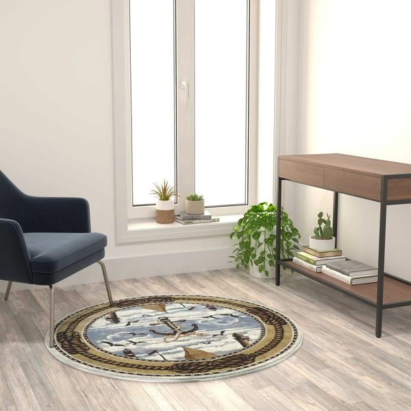 Flash Furniture Beige 4×4 Round Nautical Seaside Indoor Area Rug