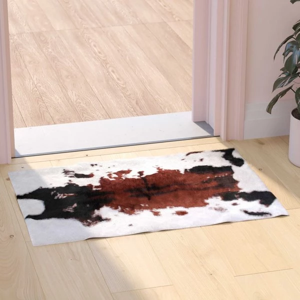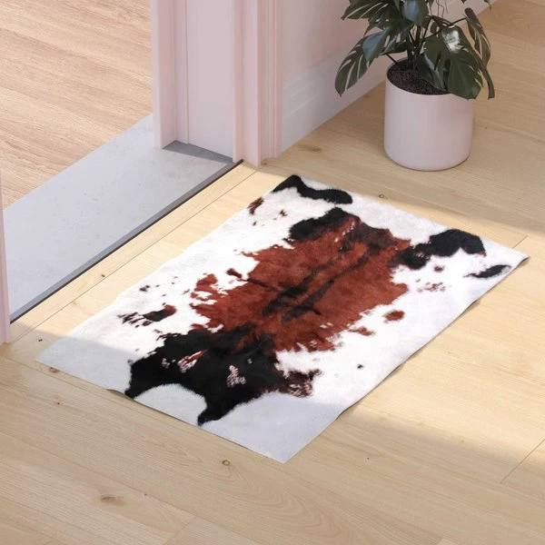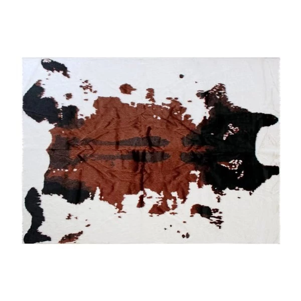 Add some old west flair to your home with the popular look of this faux cowhide print area rug. This modern area rug is completely synthetic making it a cost-effective and cruelty-free alternative to the real thing. Ultra-soft olefin fibers make this area rug an ideal choice for kids rooms, bedrooms, or living rooms. Both durable and versatile, this colorfast, non-shedding rug resists water and stains and is suitable for multiple flooring types. The eco-friendly jute backing provides structural integrity and promotes air flow. Vacuum regularly without the roller brush to maintain the looks of this cool rug. For heavily soiled areas or stains, professional dry cleaning is recommended.