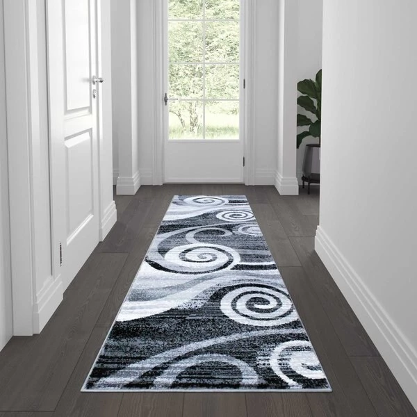Bring a dynamic look and feel to any space in your home with the spiral pattern of this modern area rug. Offering not only striking looks, this versatile contemporary accent rug adds warmth to hardwood floors, color in any area, and protects flooring in high-traffic areas. This well woven area rug can be a warm place for your feet by the bed, in front of your couch, or in the hallway. Modern materials allow today's rugs to last for years. Made from olefin fibers, this comfy area rug is stain and water resistant, colorfast, and provides a soft underfoot feel friendly to kids and pets. The jute backing gives this rug structural integrity and helps promote air flow. Vacuum regularly without the beater bar and spot clean with water and a mild detergent to maintain the look of your new rug.