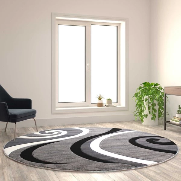 Let the sculpted, gently swirled pattern of this multipurpose area rug add unique style to any room in your home. Offering not only striking looks, this versatile contemporary accent rug allows you to add warmth to hardwood floors, color in multiple spaces, and protects flooring in high-traffic areas. This high-low pile area rug can be a warm place for your feet by the bed, in front of your couch, or in the hallway. Modern materials allow today's rugs to last for years. Made from olefin fibers, this cutting edge area rug is stain and water resistant, colorfast, and provides a soft underfoot feel friendly to kids and pets. The jute backing gives this rug structural integrity and helps promote air flow. Vacuum regularly without the beater bar and spot clean with water and a mild detergent to maintain the look of your new rug.