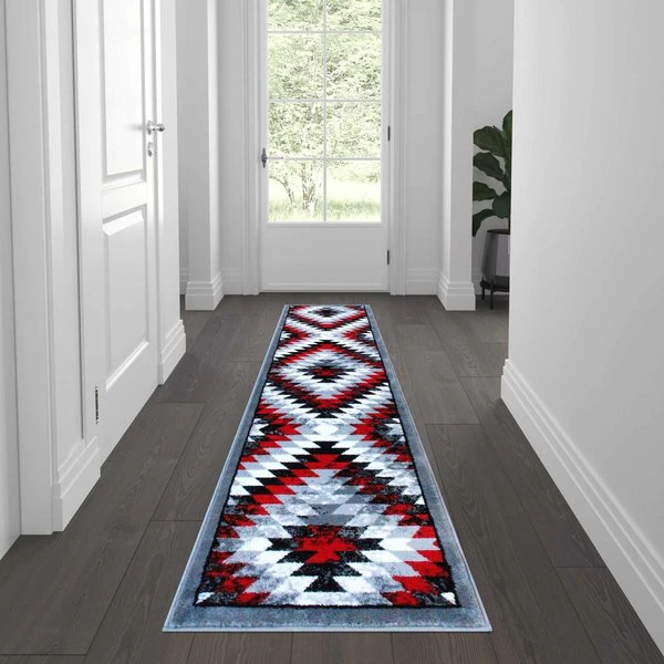 Let the dramatic design of this southwestern style area rug add some inspiration to your decor. This versatile modern accent rug allows you to add warmth to hardwood floors, dimension to small spaces, and protects flooring in high-traffic areas. This plush, high pile area rug can be used in large rooms to define the intent of specific areas. Modern rugs provide several benefits in the home. Made from olefin fibers, these contemporary runner rugs are stain and water resistant, colorfast, and provide a soft underfoot feel friendly to kids and pets. The jute backing gives this rug structural integrity and helps promote air flow. Vacuum regularly without the beater bar and spot clean with water and a mild detergent to maintain the look of your new rug.
