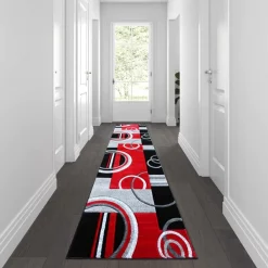 Form meets function in this stunning modern geometric abstract area rug that's ideal for any room in your home. No only does this contemporary accent rug make a statement, it also allows you to add warmth to hardwood floors, color in multiple spaces, and protects flooring in high-traffic areas. This high-low pile area rug can be a warm place for your feet by the bed, in front of your couch, or in the hallway. Modern materials allow today's rugs to last for years. Made from olefin fibers, this cutting edge area rug is stain and water resistant, colorfast, and provides a soft underfoot feel friendly to kids and pets. The jute backing gives this rug structural integrity and helps promote air flow. Vacuum regularly without the beater bar and spot clean with water and a mild detergent to maintain the look of your new rug.