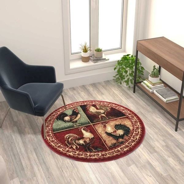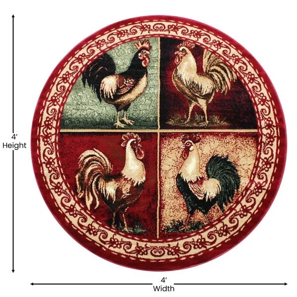 Flash Furniture Red 4×4 Farmhouse Round Rooster Themed Area Rug