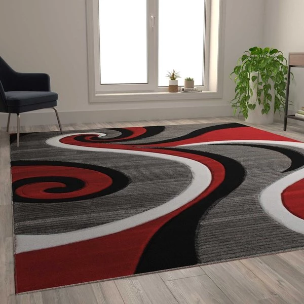 Let the sculpted, gently swirled pattern of this multipurpose area rug add unique style to any room in your home. Offering not only striking looks, this versatile contemporary accent rug allows you to add warmth to hardwood floors, color in multiple spaces, and protects flooring in high-traffic areas. This high-low pile area rug can be a warm place for your feet by the bed, in front of your couch, or in the hallway. Modern materials allow today's rugs to last for years. Made from olefin fibers, this cutting edge area rug is stain and water resistant, colorfast, and provides a soft underfoot feel friendly to kids and pets. The jute backing gives this rug structural integrity and helps promote air flow. Vacuum regularly without the beater bar and spot clean with water and a mild detergent to maintain the look of your new rug.