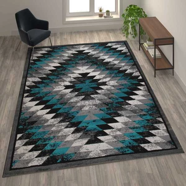 Let the dramatic design of this southwestern style area rug add some inspiration to your decor. This versatile modern accent rug allows you to add warmth to hardwood floors, dimension to small spaces, and protects flooring in high-traffic areas. This plush, high pile area rug can be used in large rooms to define the intent of specific areas. Modern rugs provide several benefits in the home. Made from olefin fibers, these contemporary runner rugs are stain and water resistant, colorfast, and provide a soft underfoot feel friendly to kids and pets. The jute backing gives this rug structural integrity and helps promote air flow. Vacuum regularly without the beater bar and spot clean with water and a mild detergent to maintain the look of your new rug.