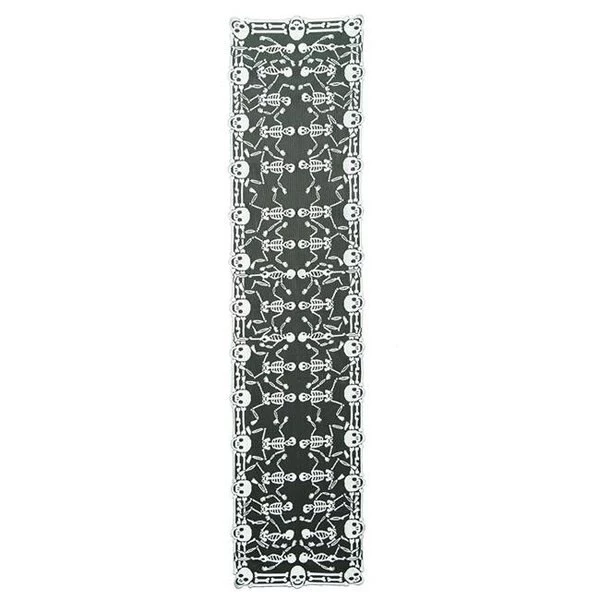 Instill any table with a festive spirit by layering on our Skeleton Dance lace runner. An easy way to set the stage for a spine-tingling spectacle they'll never forget. Shimmery pewter lace detailing is set against a delicate black netting that features delightful skeleton dancers. FeaturesSkeleton Dance Mantle Table RunnerThis versatile piece can be used as a table runner or mantle scarfMade in USA100% polyesterMachine wash cold. gentleDo not bleachLay flat or hang to dryTouch up with cool iron if desiredSpecificationsSize: 20 x 80 in.