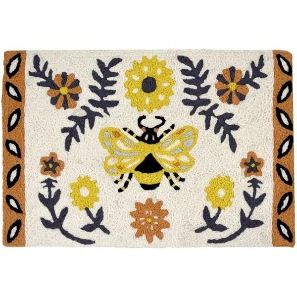 A yellow bee takes center on this soft hued Jellybean accent rug. Surrounded by blooms and decorative geometric edging this delightful. machine washable rug. will brighten the space of your choosing. This polyester rug is suitable for outdoor and indoor use. Care Instructions:Machine Wash in Cold Water with like colors on the gentle cycle in a fully loaded and balanced machineLine Dry or dry flatDo Not BleachDo Not IronDo Not VacuumDo not place in direct sunlight for prolonged periods of time or fading may occurA liner is recommended to provide slip resistance and prevent color transfer or possible chemical reaction to manufactured flooring SpecificationsRug Size: 20" x 30"Rug Content: 100% PolyesterBacking Content: 100% PolyesterConstruction: Jennifer BrinleyWeight: 2 lbs