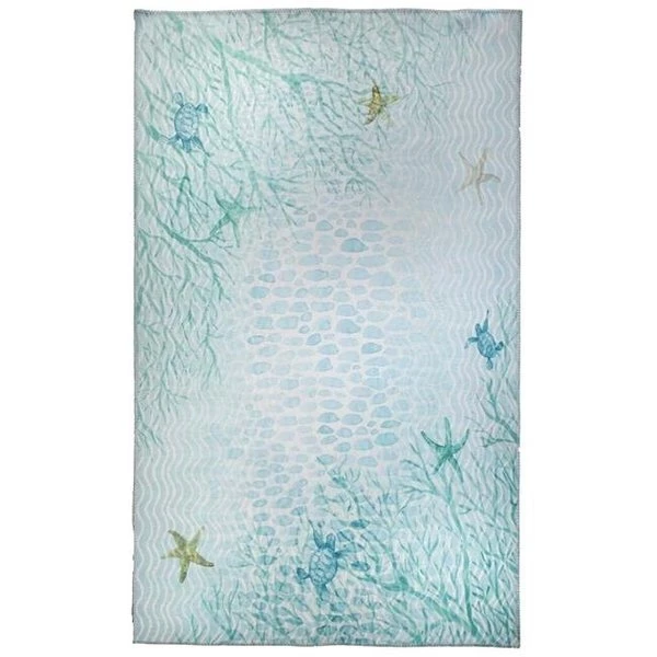 Printed polyester on this Homefires by Jellybean poly-sued floor cloth offers a clear aquamarine view of the sea coral. Designed by Sherri Buck Baldwin. this floor cloth is machine washable. Ultra thin construction allows chair to slide easily across the surface of this heat set printed floor cloth. Care Instructions:Vacuum regularly with floor only setting Do not use a beater bar or you may sweep the rugMachine wash in cold water on the gentle cycleLine dry or dry flatA liner is recommended to provide slip resistance and possible color transfer or chemical reaction to manufactured flooringSpecificationsRug Size: 3' x 5'Rug Content: 100% Super Soft Velvety Feeling PolyesterBacking Content: 100% PolyesterConstruction: Sherri Buck BaldwinWeight: 4 lbs