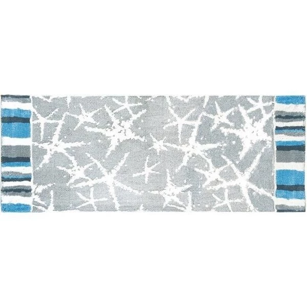 Who says your modern lifestyle cant include the tranquility of the sea Bring the seaside to your loft with this coastal themed Simple Spaces indoor rug. White starfish are nestled in a neutral gray background flanked by turquoise. navy and white stripes. The dimensional visual effect of this rug carries over to the feel with hi/lo tufted crafting. Effortless. relaxed and stylish. this Simple Spaces rug will maintain its charm with machine washable crafting. Designed by Kris Ruff.Care Instructions:A liner is recommendedMachine WashableSpecificationsRug Size: 21" x 54"Rug Content: Super Soft Polyester MicrofiberBacking Content: Polyester non-wovenArtist: Kris RuffWeight: 4.5 lbs
