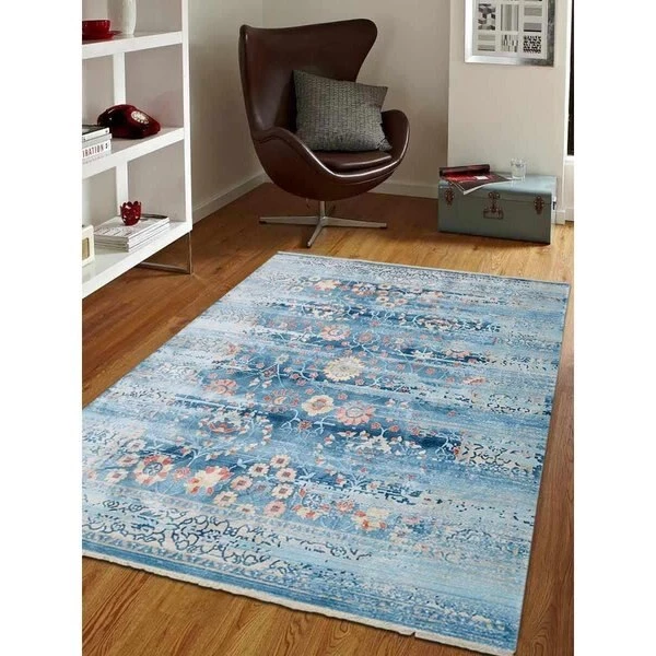 Machine Woven Crossweave Polyester Area Rug Rug up the flooring of your room in style with this blue shaded vintage rug. Its antique and traditional design will make you light hearted and it will give you a retro feel. This is a machine made rug which gives it a finesse and true colors to the imaginations of designers. You will love to lie down on its shiny and flabby Polyester stuff. Grab this astonishing piece of Rectangle rug in the perfec" dimensions of 3'11" x 5' 10". FeaturesMachine Woven by sophisticated technology enhancing detailed design and product durabilityOriental designed and weaved by machine woven cross weave technique in TurkeySoft polyester yarn with flat pile height of 0.27 inches for underfoot comfort.Designer area rugs perfect for Living Room. Bedroom. Study Room. Dinning Room. FoyerSpecificationsColor: BlueSize: 3 ft. 11 in. x 5 ft. 10 in.Construction: Machine MadeWeave & Technique: Machine Woven CrossweaveShape: RectangleMaterial: 100% PolyesterRecommended: IndoorReversible: NoFloor Heating Safe: YesNon-Slip Backing: NoCountry of Origin: TurkeyWeight: 11.18 lbs