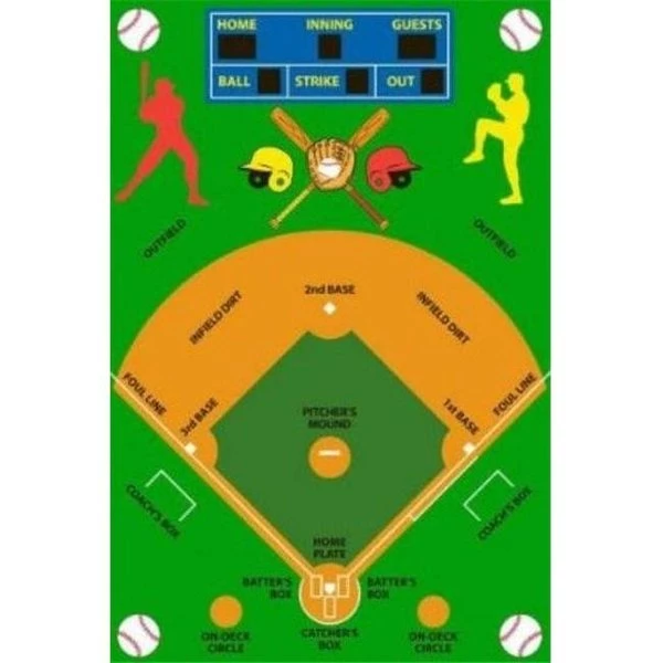 Learn baseball through this rug and score big in the major leagues! Whether you are a coach or parent. this rug can help you train or simply have fun playing with the kids. Especially. if you play baseball or are a big fan. this miniature baseball diamond designed rug will be a great highlight to any room. office. or training facility. Each corner of the rug has a baseball. while the top portion of the green outfield has a figure of a pitcher and hitter and larger helmets in two different colors. Two bats and a glove holding a ball are at the center. In primary green color. tufted rug. not machine washable.100% Nylon Pile.Latex backing helps keep the rug from shifting and slipping.Machine made in Egypt.Naturally elastic and water repellant.Spot clean with mild soap and cold water.Approximate Size: 3" W x 5" L.Depth: 58".Length: 58".Width: 39".Pile Height: 0.125".Assembled Height: 1/8".Thickness: 1/8".Indoor/Outdoor: Indoor.Stain Resistant: With Treatment.Water repellent: Yes.Material: Polyester. Latex. Other.Cleaning instructions: Hand washable.Color/Finish: Multi.Color Family: Greens.Construction: Machine-made.