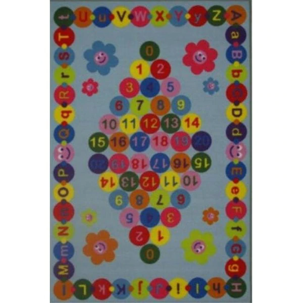 Alphabets on the side. numbers from 1 to 20 at the middle and happy flowers in the corners. A way where your child will be eager to learn letters and numbers. Colorful. tufted rug. not machine washable.100% Nylon Pile.Latex backing helps keep the rug from shifting and slipping.Machine made in Egypt.Naturally elastic and water repellant.Spot clean with mild soap and cold water.Approximate Size: 2" W x 3" L.Depth: 29".Width: 19".Length: 29".Pile height: 0.125".Assembled Height: 1/8".Thickness: 1/8".Indoor/Outdoor: Indoor.Stain Resistant: With Treatment.Water repellent: Yes.Material: Polyester. Latex. Other.Cleaning instructions: Hand washable.Color/Finish: Multi.Construction: Machine-made.