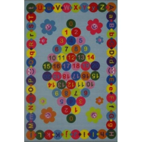 Alphabets on the side. numbers from 1 to 20 at the middle and happy flowers in the corners. A way where your child will be eager to learn letters and numbers. Colorful. tufted rug. not machine washable.100% Nylon Pile.Action Backing that requires use of gripper (sold separately).Machine made in Egypt.Naturally elastic and water repellant.Spot clean with mild soap and cold water.Approximate Size: 4" W x 6" L.Depth: 78".Width: 51".Length: 78".Pile Height: 0.125".Assembled Height: 1/8".Thickness: 1/8".Indoor/Outdoor: Indoor.Stain Resistant: With Treatment.Water repellent: Yes.Material: Polyester. Latex. Other.Cleaning instructions: Hand washable.Color/Finish: Multi.Construction: Machine-made.