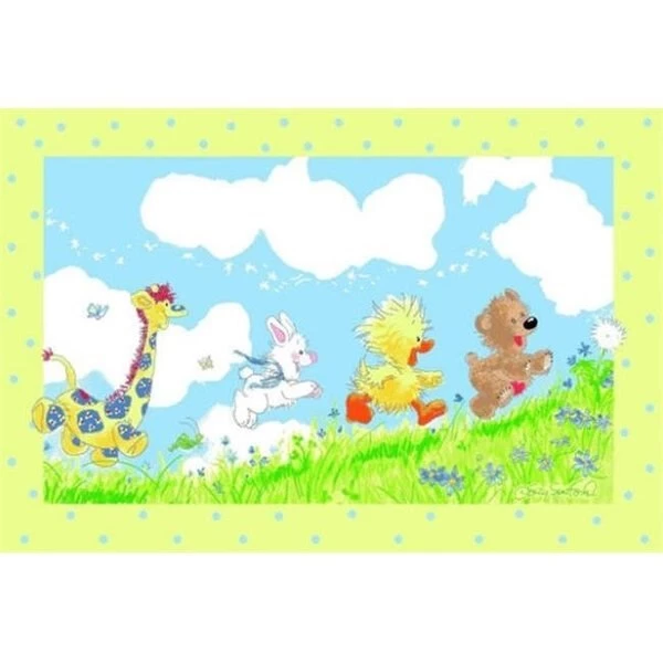 Do you wish you could have a bright and refreshing rug for your child’s bedroom or nursery? Check out the adorable Little Suzy's Zoo Looking For The Wishing Puff Rug by L.A. Rug Inc. Featuring a vibrant print of a cloudy Blue sky and emerald Green grass dotted with Blue forget-me-nots. this rug is just one of many from Little Suzy’s Zoo collection. Hopping across the green meadow are four fluffy. baby animals including a furry bear. feathery duck. bunny rabbit with a blue bow. and a colorful giraffe with blue spots and red hair. Surrounding the cute spring scene is a border of yellow and blue polka dots to tie the rug together. Are you searching for a rug that provides a safe and long-lasting solution for protecting the flooring? The Looking For The Wishing Puff Rug is constructed from 100% nylon with a durable skid resistant backing. You’ll never have to worry about fuzzy balls or loose strands of yarn coming out of your rug with the Little Suzy’s rug. which can often be a problem with other rugs. Perfect for any children’s room or other high traffic area. this high quality rug will withstand many seasons of use.Size: 39" x 58".