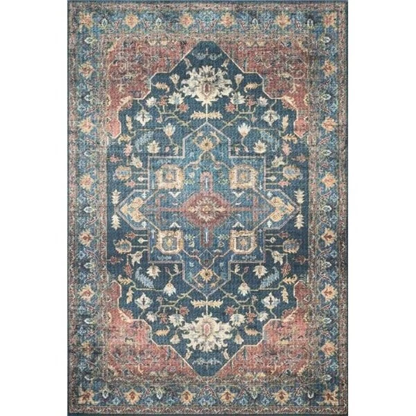 The Skye Collection is timeless and classic with a beautiful. old-world design in a variety of color choices. Power-loomed in China of 100% polyester. these printed designs provide the textured effect of high-end rugs at an affordable price. Care Instructions:Clean spills immediately by blotting with a clean. white dry sponge or cloth. Appropriate rug pad is highly recommended on all surfaces to prevent slipping. add cushion. and improve durability. The color may transfer and should not be placed directly over existing carpet. For vacuuming. use a vacuum cleaner without a beater bar or one where you can set the bar to the highest pile setting. If your vacuum has variable power settings. set on low. Vacuum full length of the rug. turn and repeat to the next area. rather than back and forth motion.SpecificationsCollection: SkyeColor: Denim & BrickSize: 5' x 7' 6"Material: 100% PolyesterBacking: CanvasPile Height: 0.13"