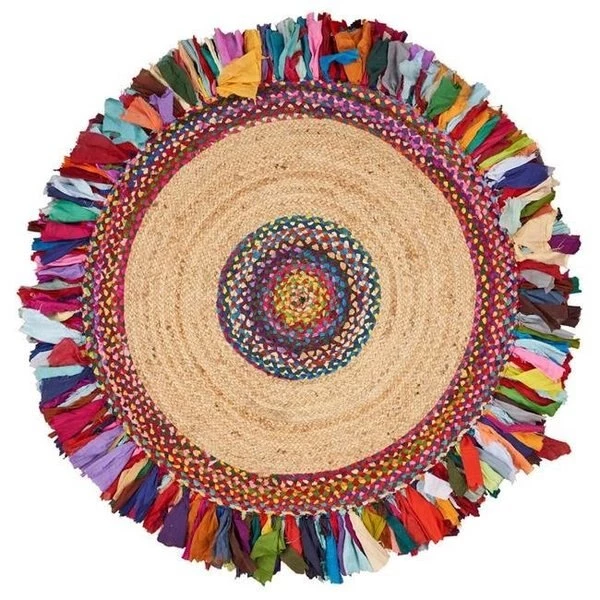 This amazingly unique hand-crafted area rug will bring out the Free-spirit in all that encounter it. The way Jute and cotton are intertwined to create a boldly colored. Bohemian inspired work of art. Seeing how this is created of natural fiber and recycled cotton each area rug will be individually special. This brings Bohemian-chic flair to any contemporary and transitional home decor. Featuring a neutral hue of jute and more vibrant hues of pink. orange. and blue. this rug is truly a work of art. FeaturesHand braided65% Cotton 35% Jute No backingSpecificationsColor: Multi ColorShape: RoundMaterial: 65% Cotton & 35% JuteCountry of Origin: IndiaWeight: 17 lbs