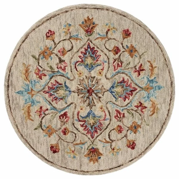 The medallion centered flowers in this piece are one of a kind. The beige toned background allows for an easy combination to a variety of different styles. Handmade in India. this piece has undergone delicate craftsmanship to bring a high quality piece into your home. The bordering edge allows for an easy transition from detailed rug to carpet or hardwood. No matter where you decide to place this piece it is sure to bring great style and happiness for many years to come. FeaturesIdeal accent piece to tie decor togetherRug pads recommend for rug longevity. safety. and to avoid scratchesCare InstructionsProfessionally CleanSpecificationsColor: BeigeSize: 4 ft.Shape: RoundMaterial: Made of 80% Wool and 20% Cotton with Cotton backingWeave Type: Hand TuftedStyle: Modern & ContemporaryCountry of Origin: IndiaWeight: 13 lbs
