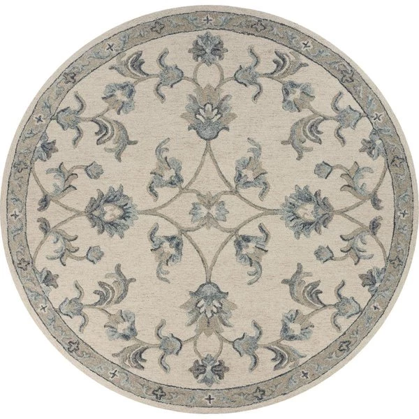 This soft toned ivory and light blue area rug displays an intricate mirroring floral pattern that is an ideal statement piece. Traditional mastery represents this piece and everything our Victorian Collection is encompassing. The detailing and craftsmanship in this piece is sure to keep you satisfied for years to come. Hand tufted in India. this piece has is hand made with acute attention to detail and fine material. Bring this piece home today for a beautiful addition to your space. SpecificationsColor: Ivory and Light BlueMaterial: 80% Wool and 20% Cotton with Cloth BackingShape: RoundCountry of Origin: IndiaWeight: 46 lbs