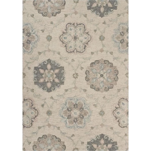 With a soft floral. geometric motif this area rug is the perfect subtle statement or accent piece for a dining area. entryway. or even an office space. Traditional mastery represents this piece and everything our Victorian Collection is encompassing. The detailing and craftsmanship in this piece is sure to keep you satisfied for years to come. Hand tufted in India. this piece has is hand made with acute attention to detail and fine material. Bring this piece home today for a beautiful addition to your space. SpecificationsColor: Ivory and Light BlueMaterial: 80% Wool and 20% Cotton with Cloth BackingShape: RectangleCountry of Origin: IndiaWeight: 39 lbs