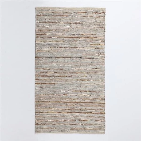 Our leather area rug feature a unique leather construction with sparkling metallic accents and a soft cotton border. This leather rug glints and shines as it catches the light. The indoor rug is really soft and made with strong durability to use for a long period of time. and is a eco-friendly rug. SpecificationsColor: BeigeSize: 4 x 6 ft.Material: Leather & CottonConstruction: HandwovenWeight: 12 lbs