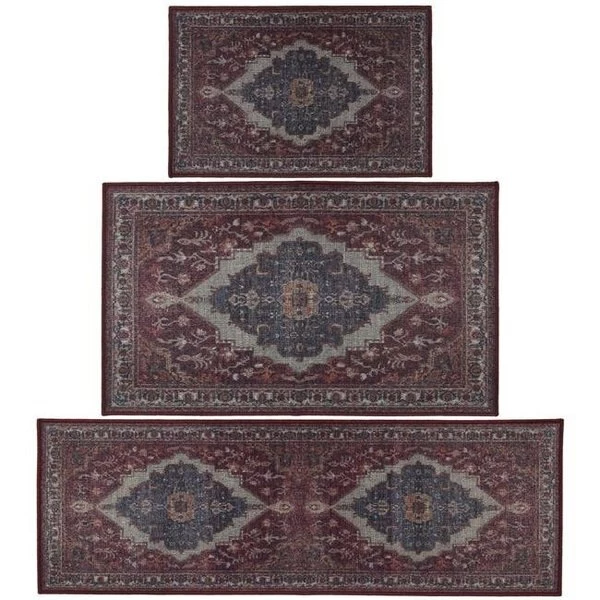 Bring fashion and flair to your home Decor with the Persian inspired design of the Layla 3 piece rug set. Consisting of one 20"x30" accent rug. one 20"x59.5" rug runner" and one 26" x 45" large area rug. this collection features a skid resistant latex back and durable nylon fibers. Easy care machine wahable and line dry. FeaturesLayla Rug Set Durable Nylon Fiber3 PieceSpecificationsAccent Rug: 20 x 30 in.Rug Runner: 20 x 59.5 in.Large Accent Rug: 26 x 45 in.Material: Nylon FiberWeight: 6.95 lbs