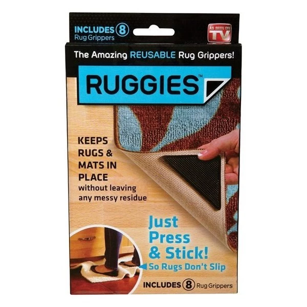 Place Ruggies amazing reusable rug grippers in the corner of any rug to help it stay put on hard floors tiles or linoleum and prevent bunching curling slipping and tripping.