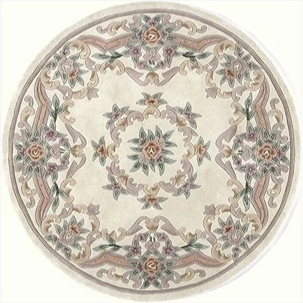 The New Aubusson Collection is hand tufted in China with the finest wool yarn. Craftsmen have created a 16th Century European Aubusson center medallion with an open field and intricate floral border pattern named after a small artistic city in Northern France. This rug has 12 colors of yarn in a thick wool pile. thus a masterpiece created for lasting beauty.FeaturesHand CraftedMaterial – 100% WoolNo FringeCollection – New AubussonColor – IvoryShape – RoundSize – 6 ft. RoundPile Height – 0.63 in.Origin – China