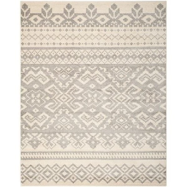 The Adirondack Collection uses modern colors and tribal designs to creat a very casual rug.FeaturesStyle – Casual.Material – Polypropylene.Color – Ivory /; Silver.Shape – Large Rectangle (;7 ft. x 9 ft. – 10 ft. x 14 ft. );.Pile Height – 0.25 in.Weave – Power Loomed.Rug Size – 8 x 10 ft.Origin – Turkey.Care InstructionVacuum regularly. Brush less attachment is recommended. Avoid direct and continuous exposure to sunlight. Do not pull loose ends;; clip them with scissors to remove. Remove spills immediately;; blot with clean cloth by pressing firmly around the spill to absorb as much as possible. For hard-to-remove stains professional rug cleaning is recommended.