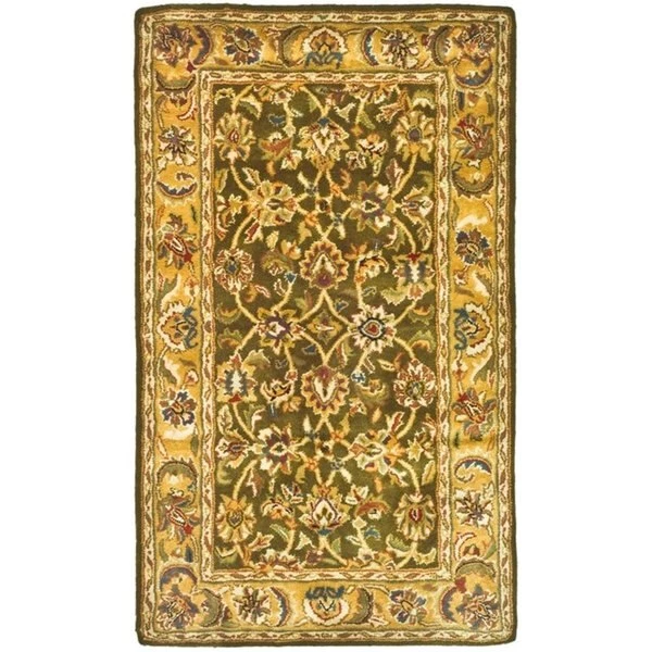 Safavieh is a leading manufacturer and importer of fine rugs. Established in 1914 in the capital of Persian weaving masters the company today brings three generations of knowledge and experience to its award-winning collections. In the United States since 1978 Safavieh has been a pioneer in the creation of high quality hand-made rugs a trend that revolutionized the rug business in America. Its collections range from the finest antique and historical reproductions to the most fashion-forward contemporary and designer rugs. Safavieh combines a Home division within its wholesale business supplied by its own production of case goods and upholstered lines from around the world. Safavieh s award-winning original collections range from the finest antiques and reproductions to the most fashion forward contemporary rugs. Safavieh offers a wide variety of transitional area and accent rugs of both Oriental and contemporary designs: wool hand-tufted Classics Hampton and Soho. Safavieh also produces a variety of rug designs from American Country styles and 19th and early 20th Century European Art. In creating the Classic Collection careful attention to each critical element of design material color and workmanship was painstakingly undertaken to meet Safavieh s award winning standards. Some of the finest Persian and European exemplary designs aDesign Type- TraditionalRug- ClassicColor- Olive-CamelRug Size- 3 X 5 Shape- RectanglePile Height- 0.625Material- WoolWeave- Hand Tufted