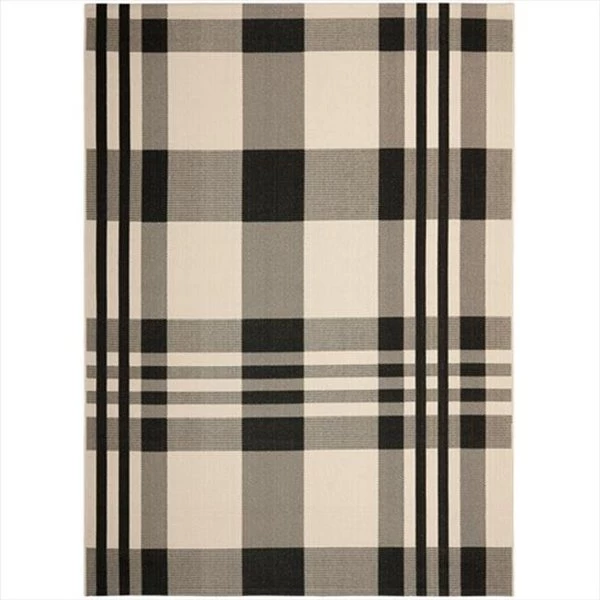 Safavieh takes classic beauty outside of the home with the launch of their Courtyard Collection. Made in Turkey with enhanced polypropylene for extra durability. these rugs are suitable for anywhere inside or outside of the house. To achieve more intricate and elaborate details in the designs. Safavieh used a specially-developed sisal weave.Features Design Type – Indoor/Outdoor Rug Collection – Courtyard Color – Black / Bone Rug Size – 8 ft. x 11 ft. – 2 in. Origin – Turkey Shape – Large Rectangle (7 ft. x9 ft. – 10 ft. x14 ft.) Material – Polypropylene Weave – Machine Made Pile Height – 0.25 in.Care InstructionVacuum regularly. Brushless attachment is recommended. Avoid direct and continuous exposure to sunlight. Do not pull loose ends; clip them with scissors to remove. Remove spills immediately; blot with clean cloth by pressing firmly around the spill to absorb as much as possible. For hard-to-remove stains professional rug cleaning is recommended.