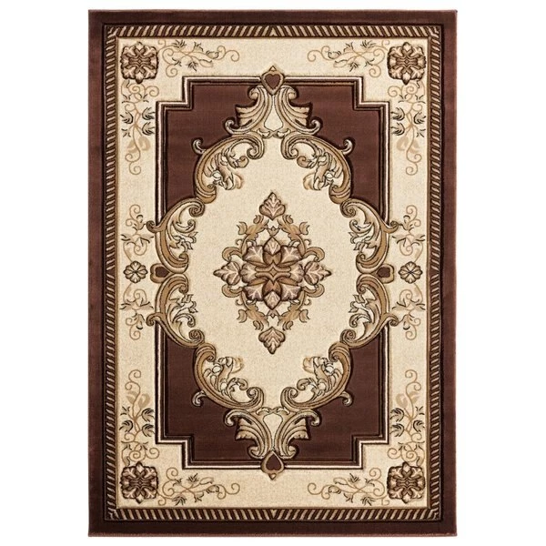 This royally grand area rug is a timeless piece to add to your interior design. This classic rug is filled with shades of chocolate brown. gold and beige. Using an intricate border design and a large medallion in the middle. this floor covering will be the highlight of your room decor. This machine-made rug has a hand carved design and is stain and fade resistant for your lifestyle needs. SpecificationsCollection: BristolColor: ChocolateColor Code: 10551Shape: RectangleRecommended Use: IndoorBacking Material: JuteMaterial: Olefin. PolypropyleneStyle: Traditional/OrientalConstruction: Machine MadePile Height: 1/2"Size: 2 ft. 7 in. x 4 ft. 2 in.Country of Origin: TurkeyWeight: 8 lbs